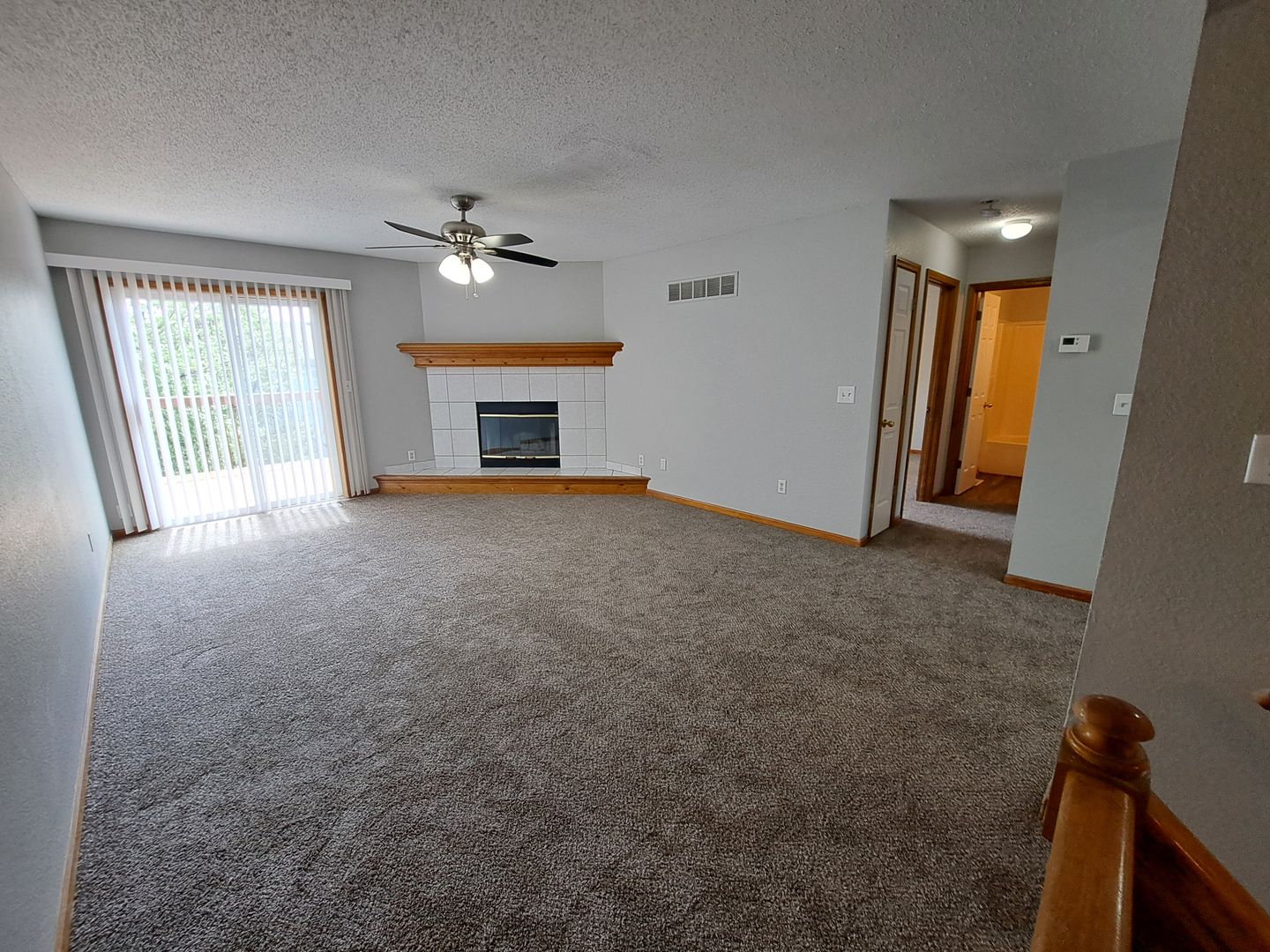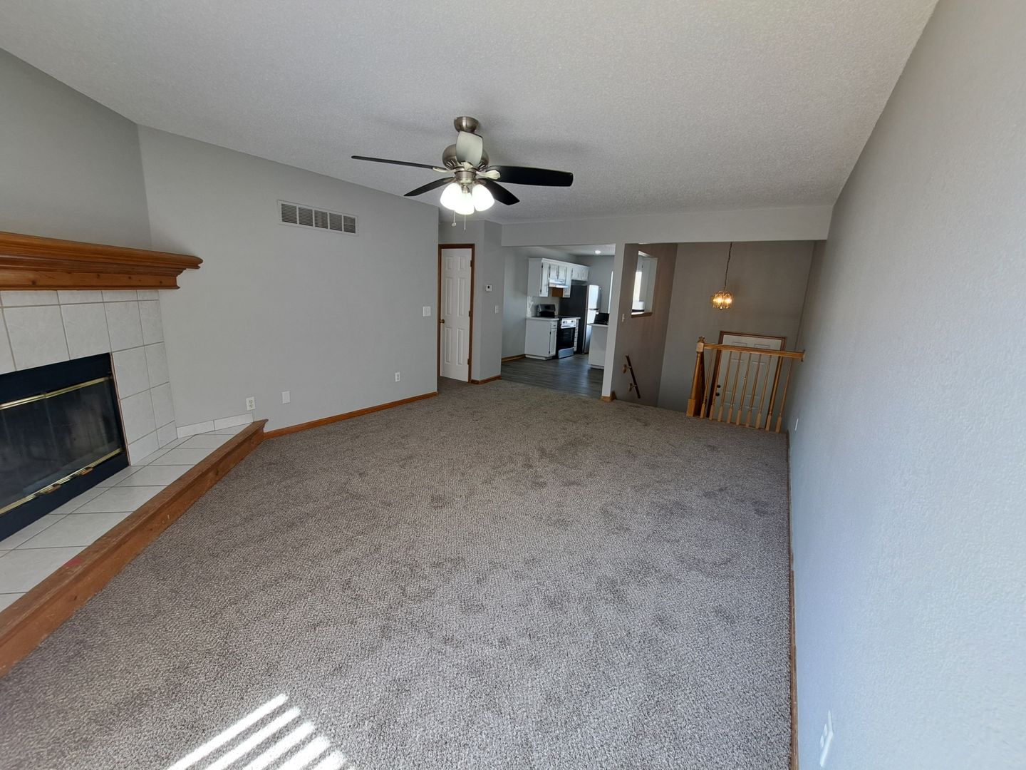 Main level has living room, kitchen with tons of cabinets and a separate dining area, decorative fireplace, 2 bedrooms, and bathroom